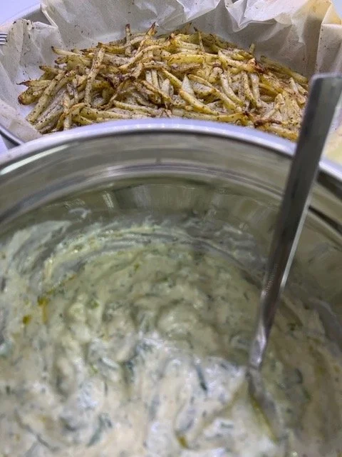 3). In a mixing bowl, prepare the sauce. Add yogurt, finely-chopped dill, chopped spring onions, garlic, paprika and lemon juice. Mix well and season to taste.